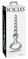 Gebogene Analkugelkette aus mundgeblasenem Glas mit 7 Kugeln und praktischem Rückholring. Geruchsneutral, antiallergen und sehr hygienisch, da einfach zu reinigen.